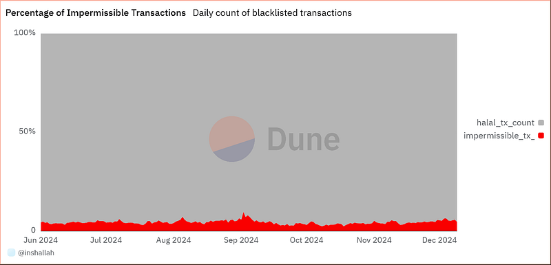 We have observed that haram transactions are not in the majority. Using DefiLlama, we analyzed the permissibility of all protocols that have Total Value Locked (TVL) above US$ 50 million. This represents about 97% of the TVL of all tracked applications on the Ethereum layer 1 (L1). According to our analysis, the average percentage of impermissible transactions is about 5% of the total number of transactions on Ethereum L1. The daily percentage of impermissible transactions ranges between 2.5% — 10%.