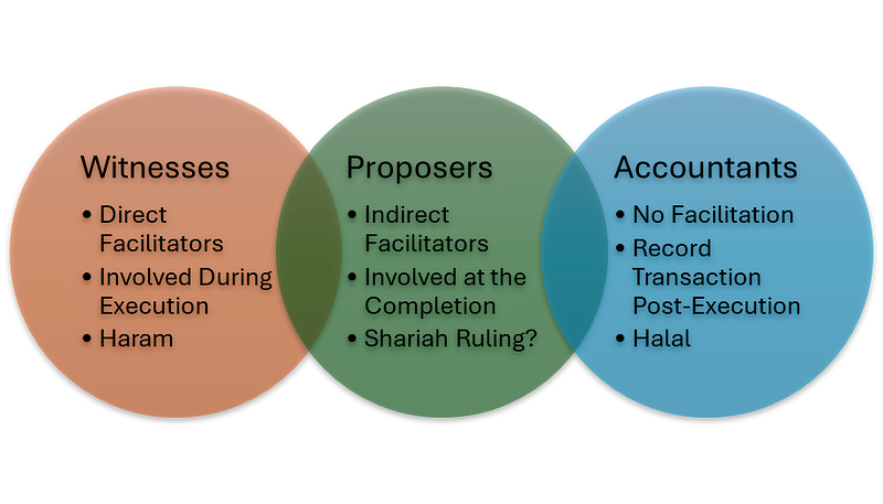 This distinction highlights the proposers’ dual function as both recorders (post-execution, halal) and facilitators (during execution, doubtful), making their role partially unique compared to that of accountants. Hence, they are not exactly the same as accountants, but share some similarities with them. But does it mean that they are closer to the writer or witness of Riba? We will address this question in the next part.